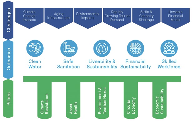 As outlined in Figure 1, the Water Sector Strategy 2050 is built on five strategic pillars that provide a comprehensive approach to addressing water-related challenges. These strategic pillars ensure that the Strategy responds to climate vulnerability, focuses on renewing ageing infrastructure, contributes to the circular economy, enhances the natural environment, and builds on the long-term financial viability of the water sector itself.